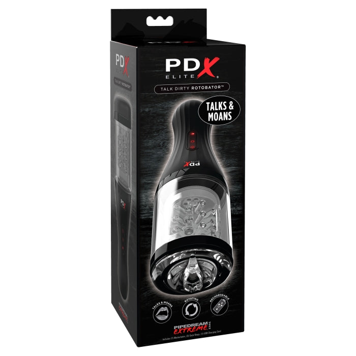TALKING & MOANING * Suggestive sex talk provides a powerfully erotic sensual experience. 3 BUTTON OPERATION * Control your ultimate pleasure with the touch of a button. USB RECHARGEABLE * Ready when you are! Easily and conveniently rechargeable offering hours of enjoyment. Every PDX ELITE Talk Dirty Rotobator includes a USB Cord for convenient recharging. HEADPHONE JACK * Listen privately by plugging your headphones into the bottom. EZ GRIP * Handle The ergonomic design features a matte surface and thin grooves that offer a solid grip. SIMPLE 3 BUTTON OPERATION * An ultra-strong rechargeable motor provides voice and rotation control. SPINNING ACTION * Features 7 satisfying rotation patterns in two directions. RALISTIC TOPPER * Supple lips snugly hug your shaft.