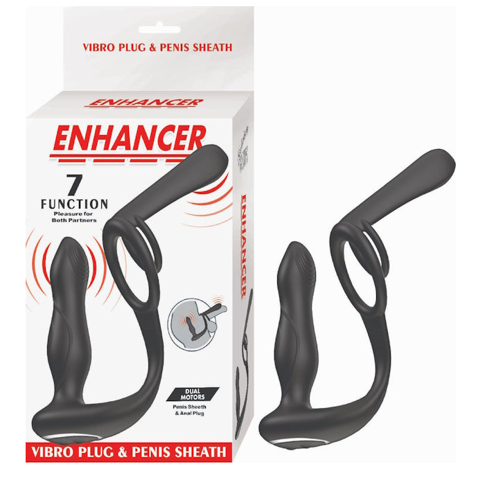 Take your pleasure, and your partner's, to the next level with the Nasstoys Enhancer Vibro Plug & Penis Sheath! This versatile toy combines a girth-enhancing penis sheath with a vibrating anal plug for double the sensation and excitement. Designed with dual motors and 7 thrilling vibration functions, it delivers powerful stimulation both internally and externally. The dual ring design not only enhances and maintains erections but also distributes pressure more comfortably for longer, more satisfying play sessions. Plus, it's USB rechargeable, splash-proof, and comes with a remote control for effortless hands-free fun, perfect for spicing things up during partner play. Crafted from body-safe silicone, the Enhancer Vibro Plug & Penis Sheath is flexible, quiet, and designed for maximum comfort and pleasure. Make sure to fully charge it before first use to get the best battery performance, and don't forget to grab some water-based lube to enhance every sensation. After your session, clean thoroughly with toy cleaner or mild antibacterial soap to keep it fresh and ready for next time. Whether you're looking to boost your own pleasure, thrill your partner, or both, this dual-action sheath is ready to deliver bigger, better, and buzzier experiences every time.